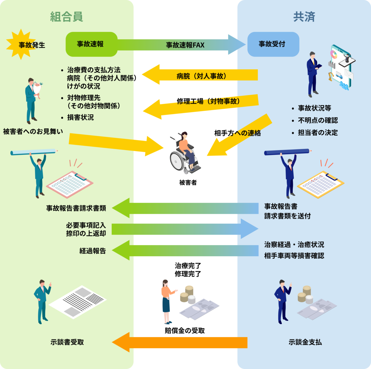 共済へのご連絡から解決までの流れFlow 兵庫県交通共済協同組合では、迅速に事故の解決を進めます 兵庫県交通共済協同組合では、組合員さまからのご連絡以降、下記の流れで事故の解決を進めます。 事故発生直後から組合への連絡までの流れについてはこちらをご確認ください。 事故発生時に必ず読むページ 事故が発生したら 事故発生時に必ず読むページ交通事故に伴う責任共済へのご連絡から解決までの流れ事故発生時のよくあるご質問・ご相談